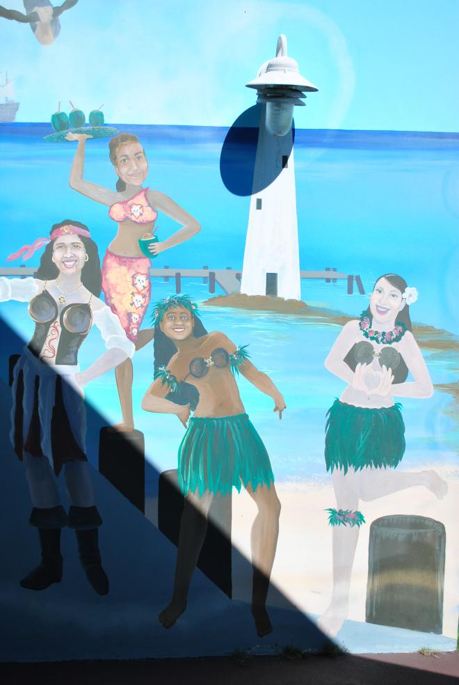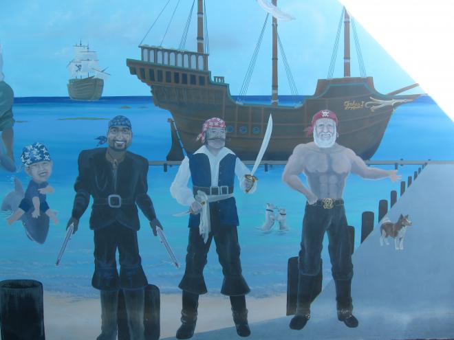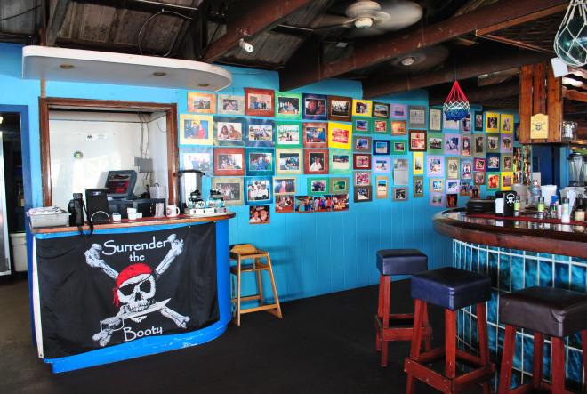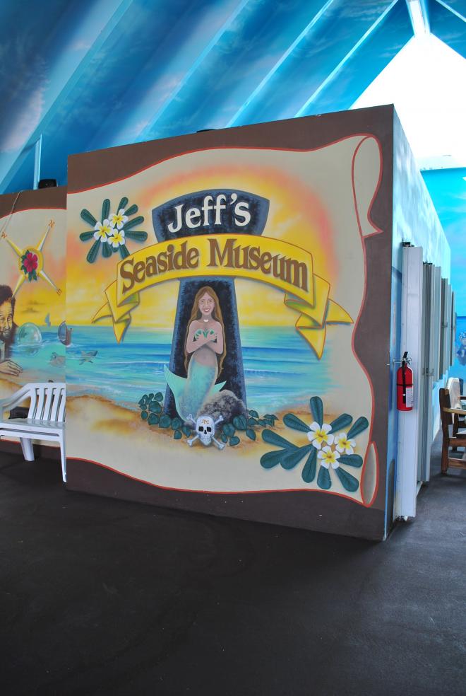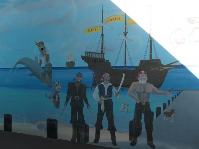 「傑夫海盜餐廳 Jeff's Pirate's Cove」前的停車場有非常明顯的識別物寫著「Jeff's Pirate's Cove」,想錯過實在很難,廣場皆可停車,無論是否消費皆可以進入餐廳裡面參觀拍照,也可以穿過吧台與用餐區進到餐廳後面,有寬闊的草地與一望無境的海,還有具有巧思的壁畫作品可參觀哦!
