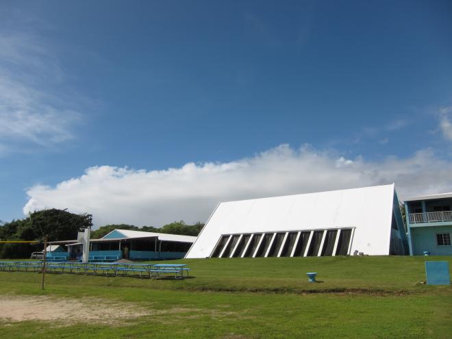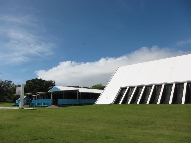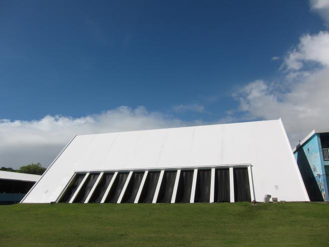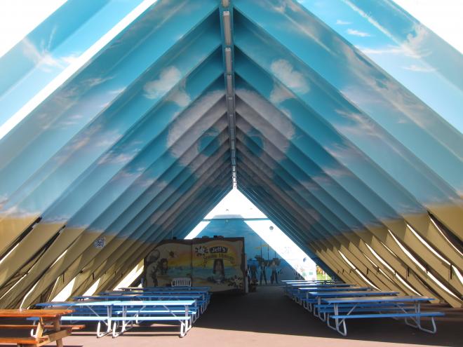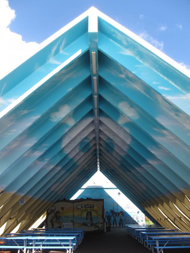 走出戶外,這棟三角造型的建築立即映入眼簾,用來遮風避雨的屋頂內部漆上了藍天白雲,以彌補無法抬頭仰望天空的不足,哈哈,真是太體貼了。