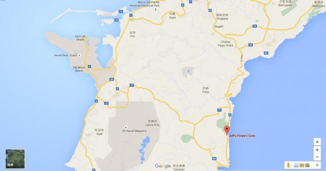 「傑夫海盜餐廳 Jeff's Pirate's Cove」位於關島南部4號公路上,無論是順時鐘或逆時鐘環關島南部一定會經過,如果您是一早用過早餐或中午用完餐之後才出發往南部觀光,會建議您依逆時鐘方向走,若是在接近中午時段(約11:00)才出發,則建議您依順時鐘方向走,這樣才能到「傑夫海盜餐廳」享用美味的BBQ與漢堡大餐,不然吃飽了才來「傑夫海盜餐廳」就只能看海景喝飲料了,美味當前卻吃不下那有多可惜啊!!