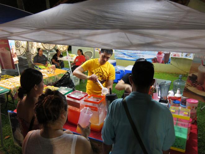 夜市裡這一攤飲料攤桌上五顏六色的飲料是查莫洛文化裡一種代表性的飲料,飲料罐裡的顏色不是添加色素,而是水果天然的顏色,查莫洛人將水果刨絲加入飲料罐中,所以可以喝到滿滿最天然的水果原味以及果肉哦!