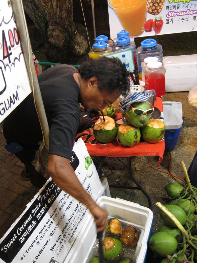 老闆將椰子剖開並將椰肉刮下擺放於椰子殼內,此時老闆會倒入摻了『哇沙米』的醬油,這就是關島椰子創意吃法~《椰子果肉沙西米》!老闆所選擇的椰子都是較「幼齒」、不過熟的,這樣果肉的口感才會軟嫩,椰子果肉沾著哇沙米醬油吃,帶著微微的鹹味與嗆辣感,非常的爽口,在四季如夏的關島,真可說是一道極划算的飲料,可解渴又可嘗鮮喔!
