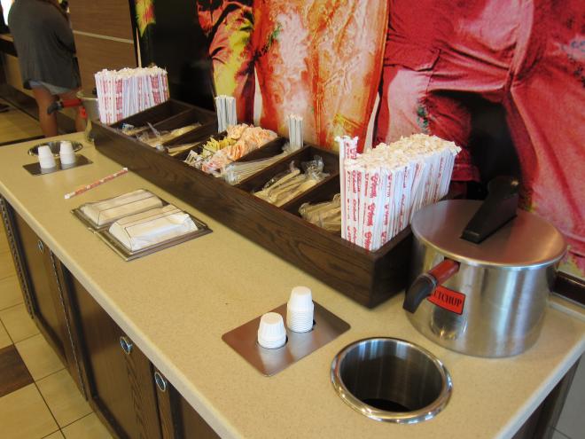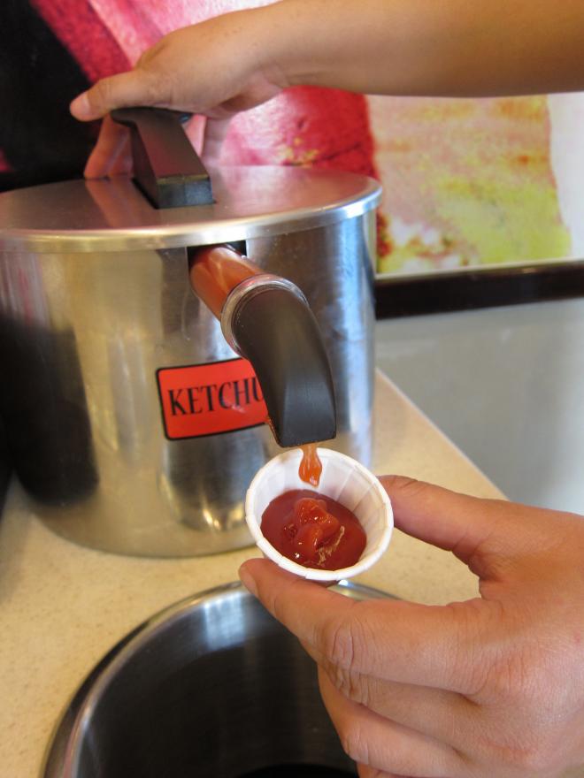 餐檯區,需要甚麼餐具自己拿,左右各有一大桶番茄醬。