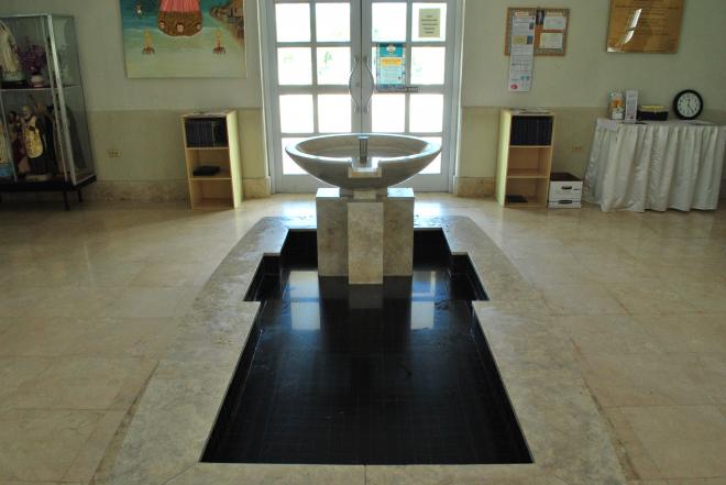 ▲一踏進教堂內部即可見此水池,或許在天主教教義下,此水池具有某種特殊的用途吧!