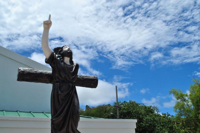 ▲這個十字架上的耶穌手指著天,似乎是在敘述那天耶穌被釘在十字架上時所說的第一句話:「父啊!赦免他們;因為他們所做的,他們不曉得。」